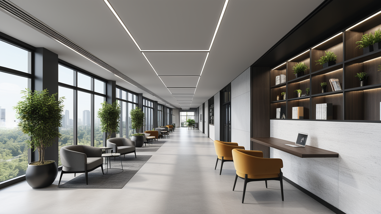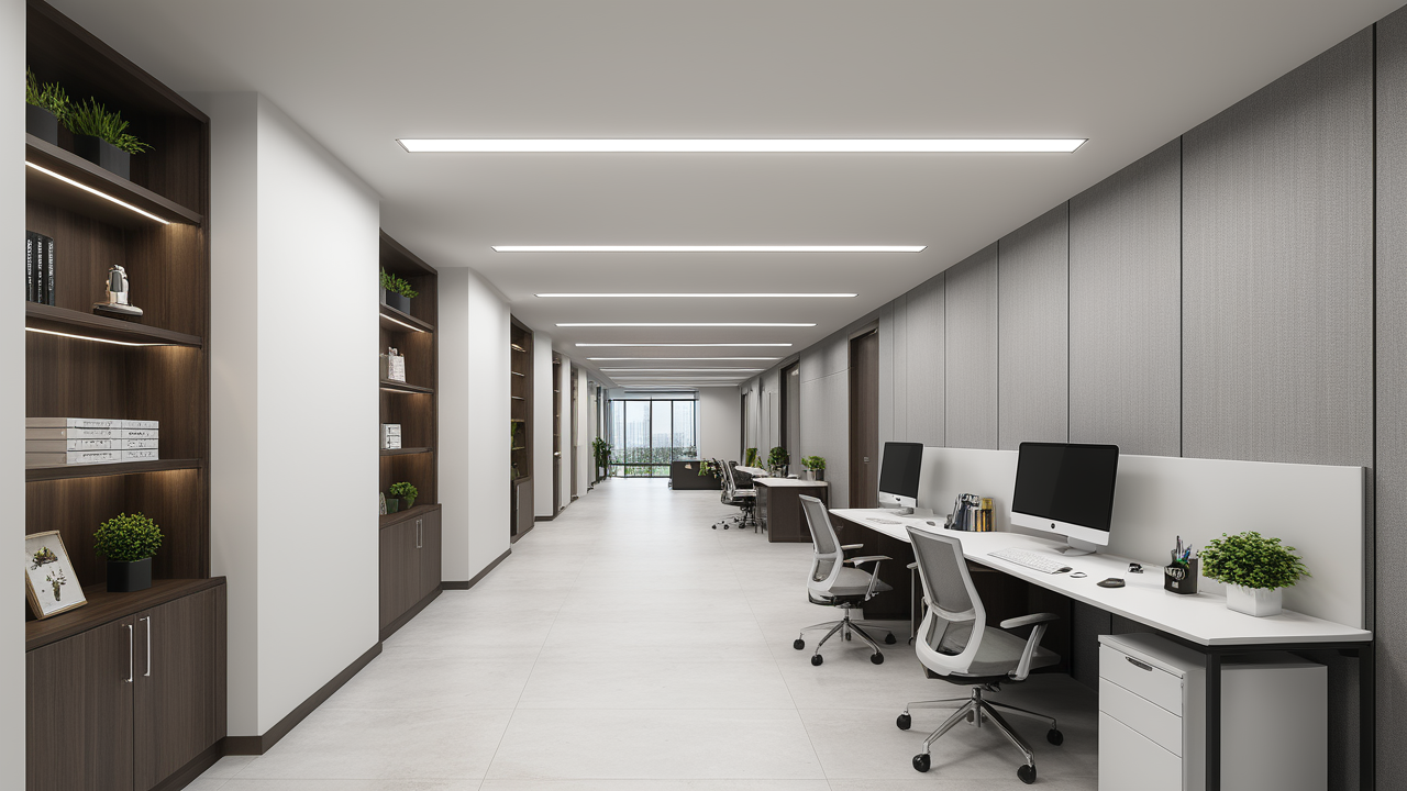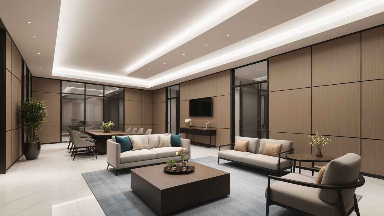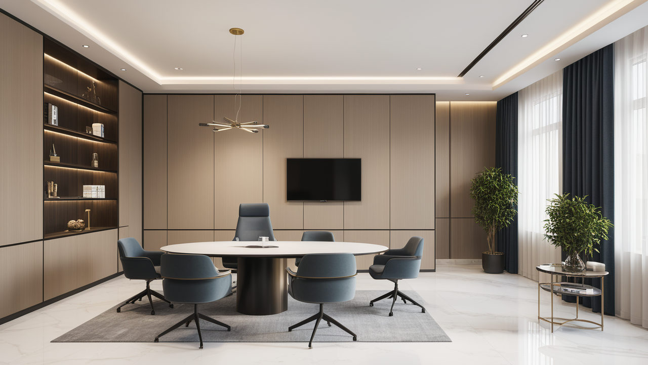 本案設(shè)計中考慮總經(jīng)理的辦公室空間布局時,因?qū)λ麨槿藝?yán)謹(jǐn)、負(fù)責(zé)、勤儉的優(yōu)良品行有所了解,特摒棄了一切繁文縟節(jié)的矯飾,一切盡在實用、明快而流暢的格局中;配合現(xiàn)代辦公環(huán)境的追求,設(shè)置實用與展示性相結(jié)合的整墻書柜,旁倚商務(wù)型老板桌,既陳設(shè)精雅、品味清亮、格調(diào)一致,又可于繁忙后賞窗外風(fēng)光、待客會友;簡潔的吊頂,照顧到了辦公、會客區(qū)的燈光劃分。