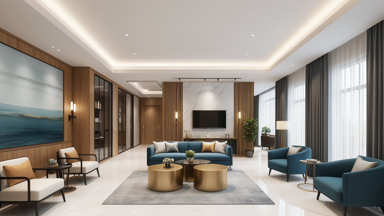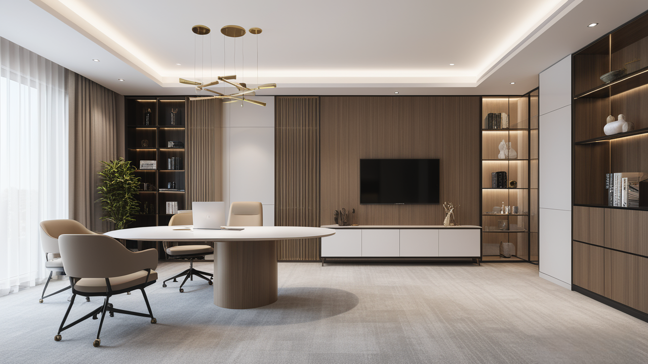本案在設計中因為空間較寬敞,加之衛生間門的開向正對室內,特設計了展示性隔斷柜,加強其辦公、會客及生活的區域性,既做到了空間上的劃分,又可通過展示柜內的擺設輔助室內布置呈現事業風貌及個人雅興,體現其穩重而時尚的人性化的特點。