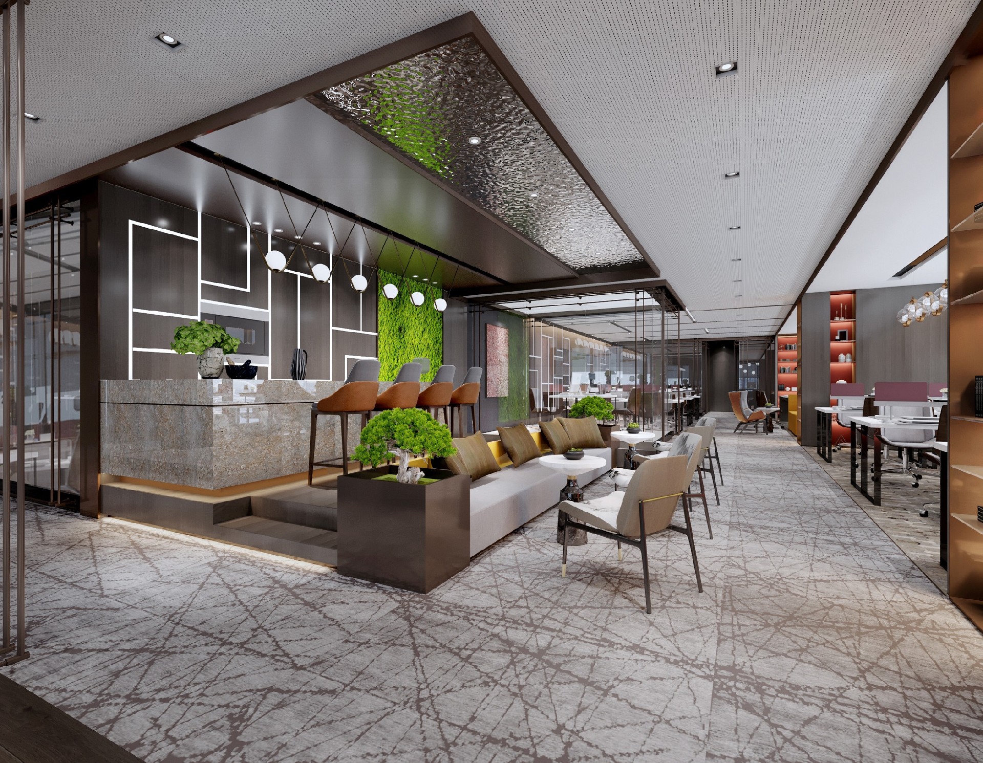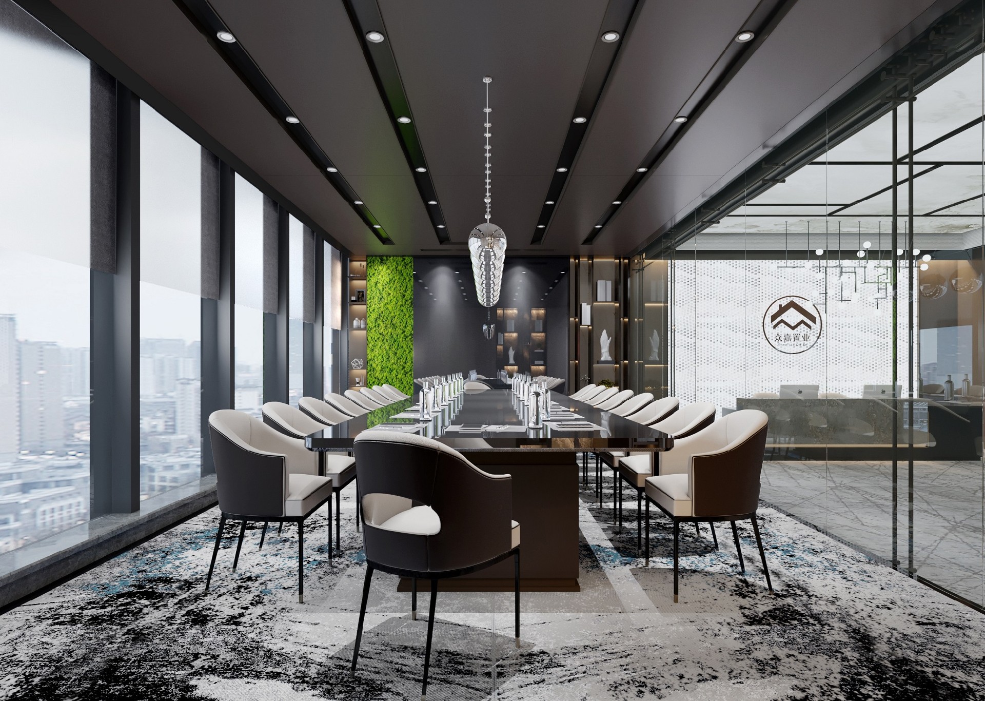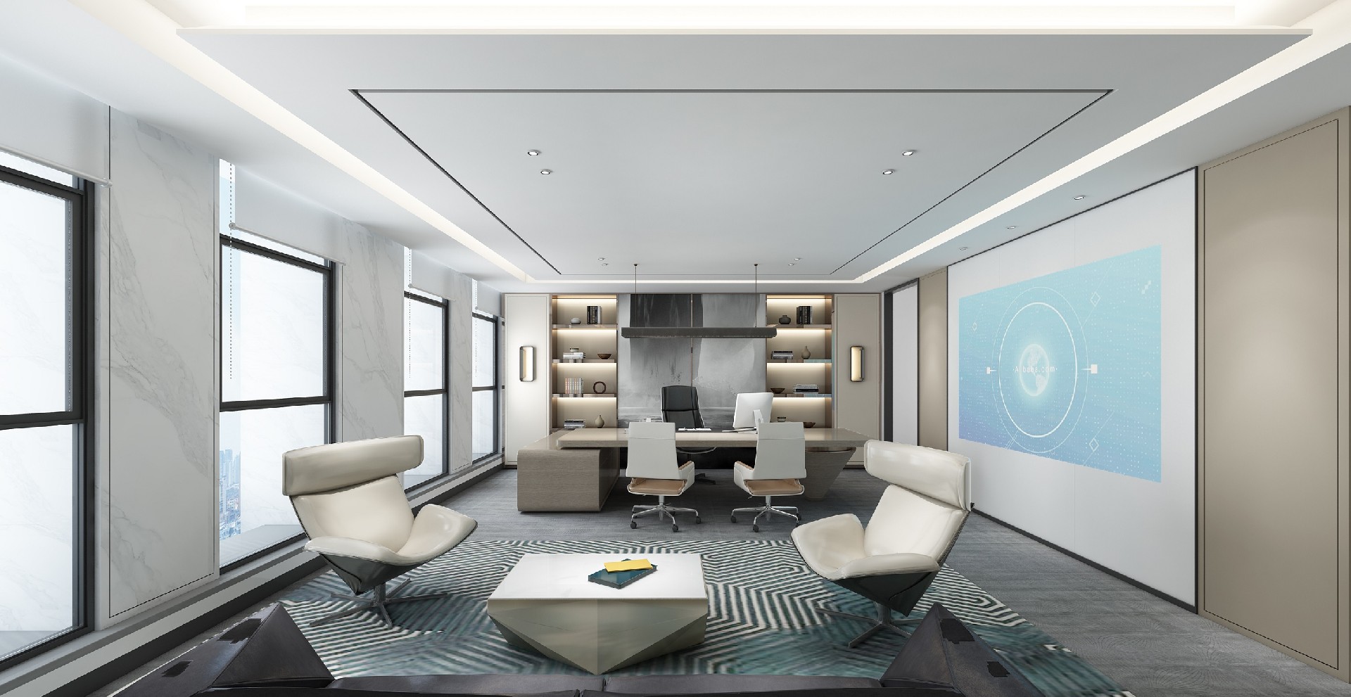 本案在這個辦公室設(shè)計中,甲方要求,有功能區(qū)設(shè)置,有總經(jīng)理,總經(jīng)理是本公司中最高的職務(wù),所以在我的設(shè)計中給他選擇了一個比較好的朝向,采光比較好、地面采用仿古顯紋復(fù)合強化淺色木地板。防滑耐磨。幾何式的辦公桌莊嚴(yán)不失人性化。自然的美巧妙的運用到設(shè)計之中,突顯對美好生活的向往。放松工作時的狀態(tài),副總經(jīng)理兩間,裝修風(fēng)格跟總經(jīng)理相符,比較統(tǒng)一。會議室,在平面功能上??紤]了合理的行動路線,東面墻對應(yīng)窗的位置設(shè)計了落地的玉砂玻璃隔墻,以滿足展示區(qū)的采光要求。