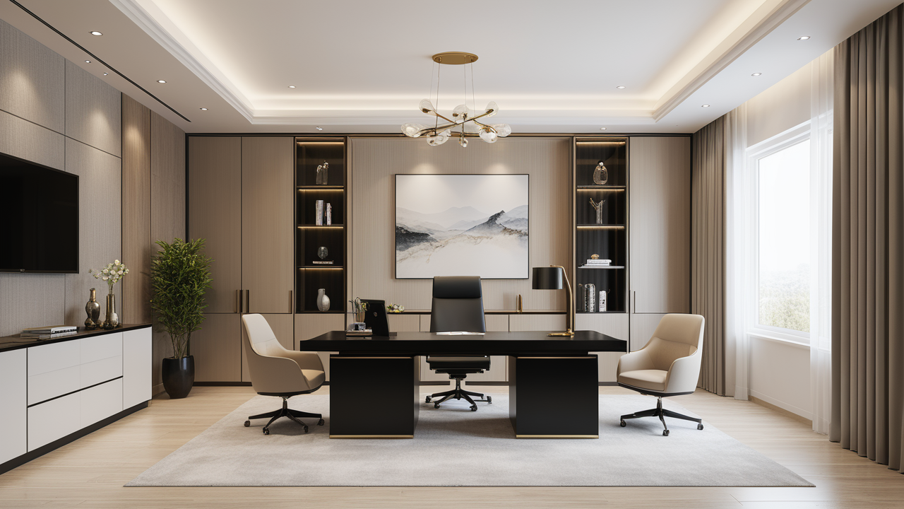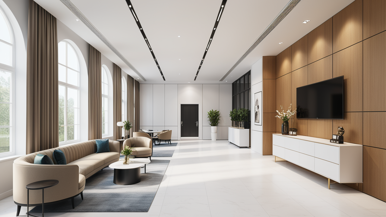 本案設計首先闖入眼簾的是企業形象墻,以其企業文化的新興、蓬勃、嚴謹為主題,兩側以“居有竹、步步高”的銀色墻柱帶來視覺沖擊感,加上企業形象色的類比色、淺色石材及不銹鋼條的運用,顯示出金屬的質感和工業文明的主題;華堂上方呼應以直線為主調、大筆勾勒而出的時尚型弧面吊頂,大直大方顯示出強烈的縱深感,加之以清透、明媚的光色渲染,工整氣派、大家風范,反襯出貴公司辦公樓的現代時尚特性,以干練快捷的設計節奏,展示出質量與效率并舉的時代精神。