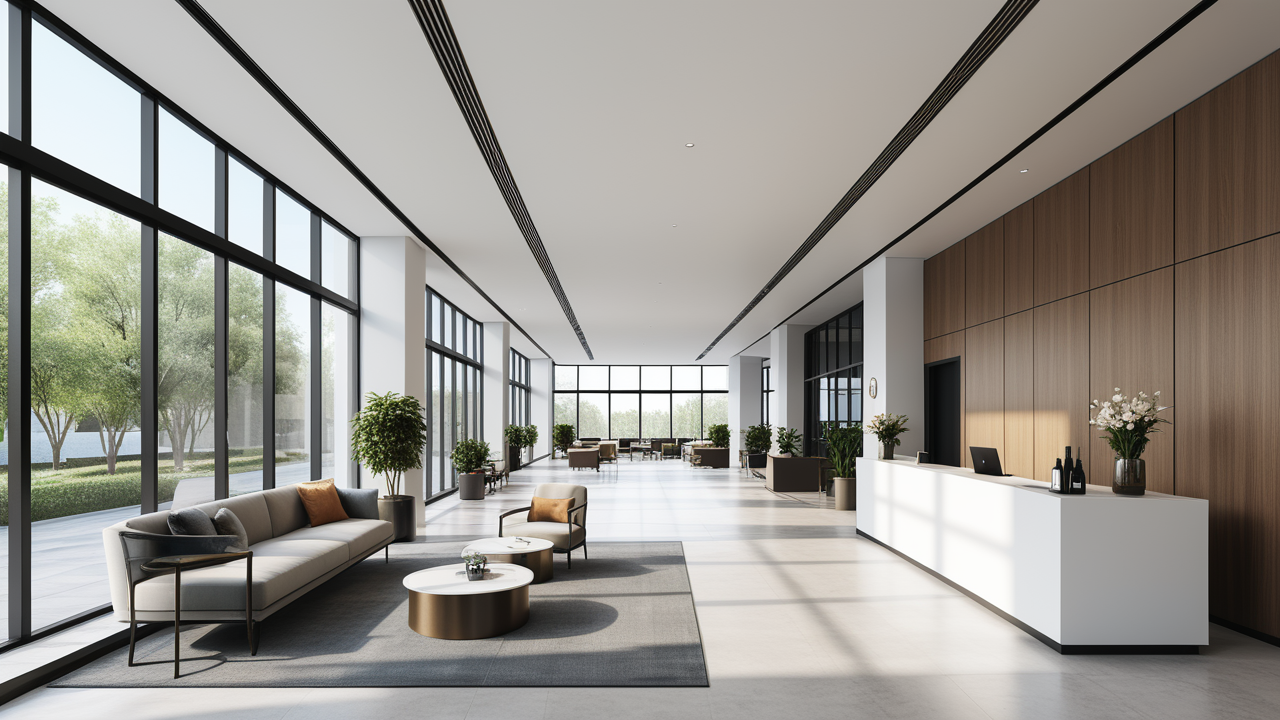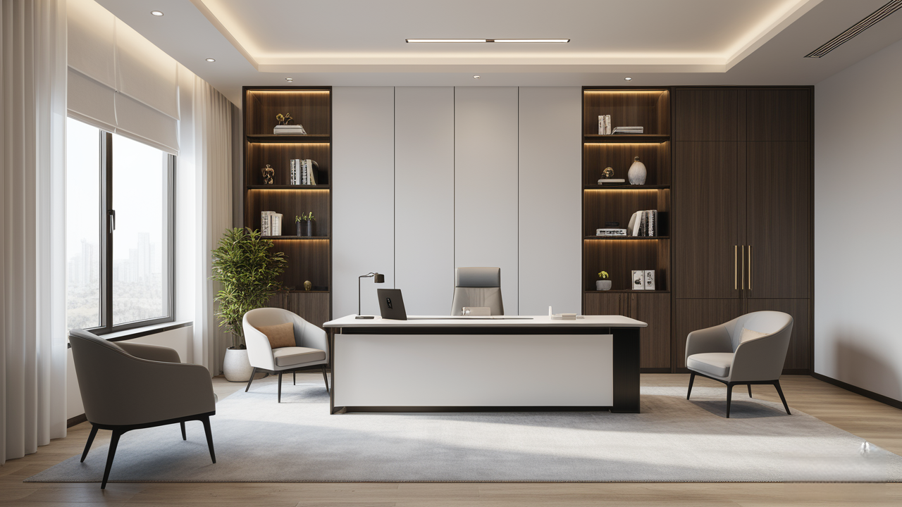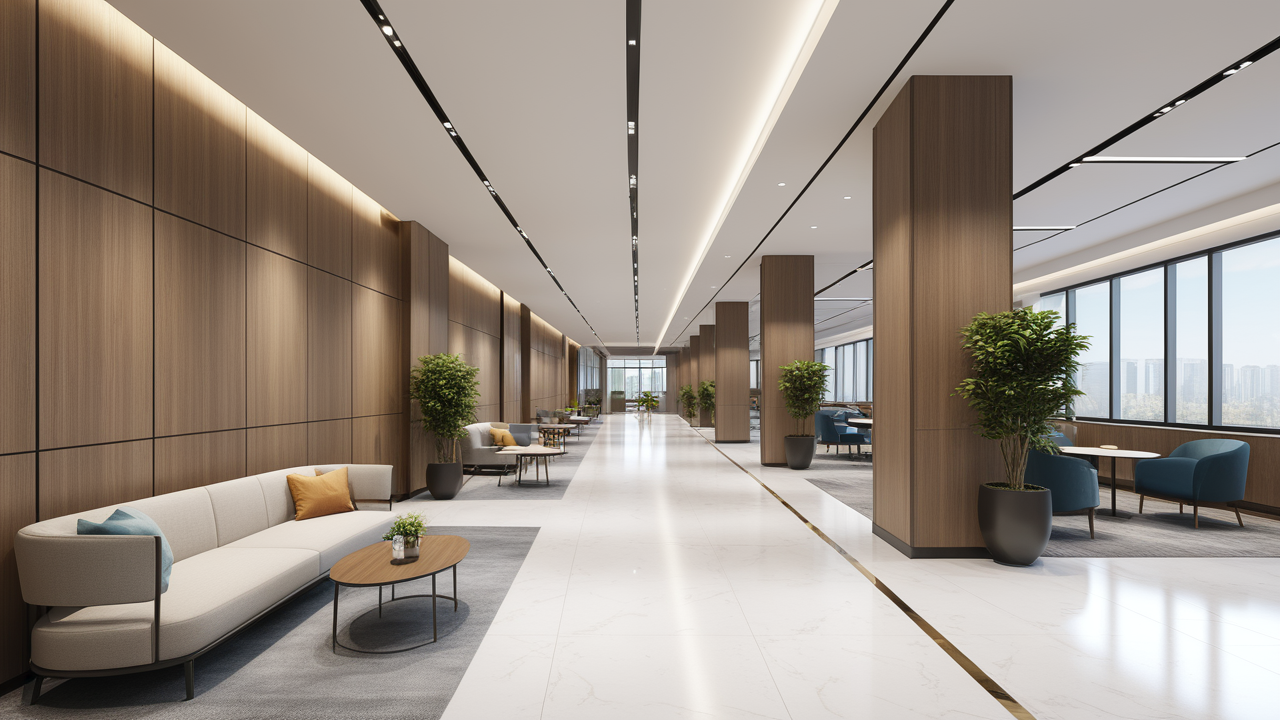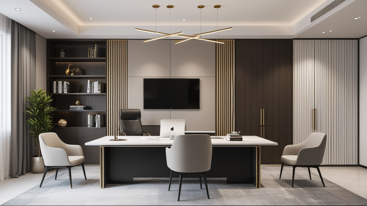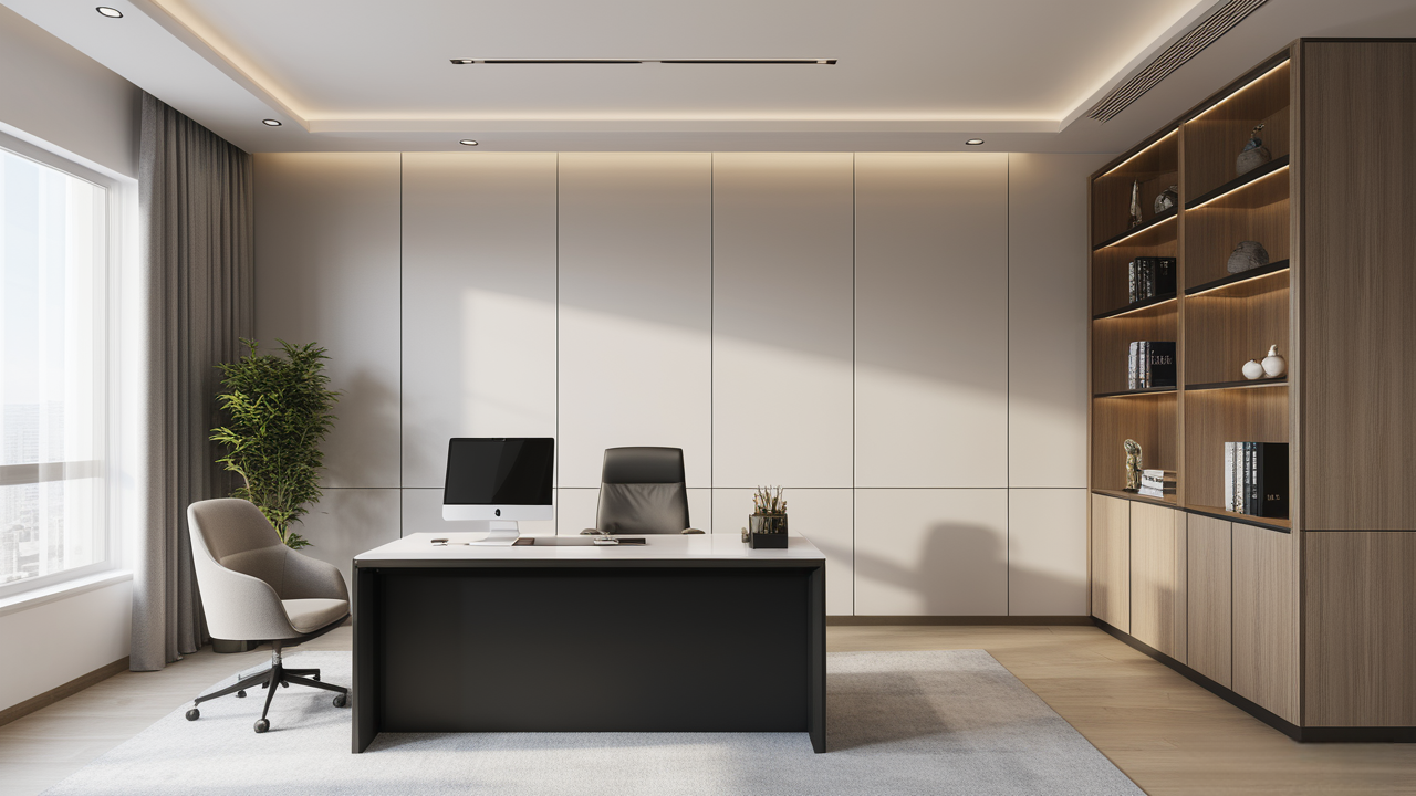 本案設(shè)計(jì)在處理上,特設(shè)計(jì)了可向客戶展示企業(yè)榮譽(yù)品的展示墻,用料實(shí)際,無(wú)須雕琢張揚(yáng),直線條的造型讓整個(gè)空間顯得穩(wěn)重大方,淺色系材料的運(yùn)用延續(xù)了靈動(dòng)而清澈的氣韻,大方莊重卻內(nèi)含現(xiàn)代時(shí)尚。而且色調(diào)淡雅的地毯、沙發(fā)、背景,還突出了接待廳親切、和睦、寬松的氛圍,使穩(wěn)靜而坦誠(chéng)的晤談氣氛盎然一室。